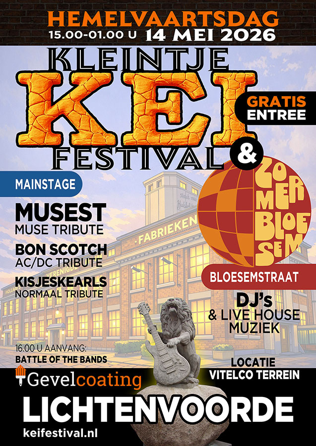 Op de MainStage trapt Kleintje Kei om 16:00 af met de Battle of the Bands, gevolgd door een sterk avondprogramma vol live muziek. Denk aan stevige gitaren, herkenbare riffs en volle bak energie. Met onder andere een knallende AC/DC tribute, een Muse tribute en een Normaal tribute die het terrein gegarandeerd op z’n kop zetten.